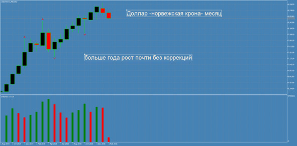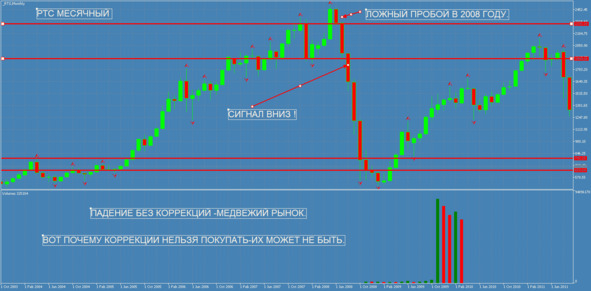 3) Сама неспособность обновить верхи или низы тенденции -есть слабость и издыхание тенденции и проявляется так: цена пробивает свечу с фракталом и возвращается обратно (не может), опять пробивает и опять возвращается -данное поведение -это ложные пробои. Часто такая рыночная слабость происходит на пиковых (больших) эмоциях толпы, выражается это все критическим объемом на графике. Таким образом, если тренд не показывает критических объемов и спокойно продолжает обновлять свои верхи (низы), то он все также силен и переживать нечего. Следить за сигналами критического объема и ложными пробоями – это очень важная работа для трейдера, когда уровни нам не понятны- проводим уровни по открытиям месячных свечей…