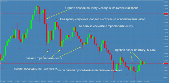 7) Почему при отсутствии фрактальных уровней поддержек и сопротивлений на месячном графике для определения разворота используют ближайшие уровни закрытия (открытия) месячных свечей по итогу месяца (бычье и медвежье поглощение)?