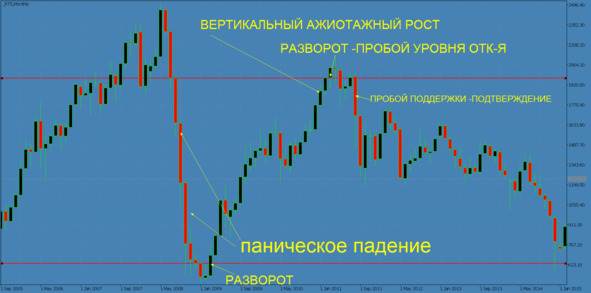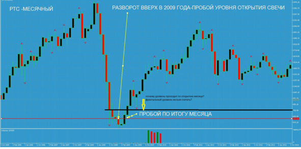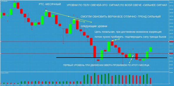 Разворот по РТС – это пробой уровня сопротивления или поддержки по итогу месяца (подтверждается другими рынками, то есть разворотами по ним).Или пробой уровня открытия свечи, когда уровни не понятны, но по свечам видно отвесное падение (паника) или вертикальный безкоррекционный рост (ажиотаж)