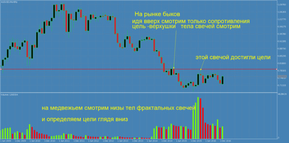 При движении вверх (когда возник сигнал бычьего тренда) мы не учитываем уровни поддержек (то есть уровни свечей с фракталами снизу), так как тренд изменился. Спокойно определяем целевой уровень —проводим по свече линию (отбросив тень) и мы знаем теперь цель. Дойдя до цели рынок в 90% случаев пойдет в коррекцию и из которой потом рано или поздно найдется способ двинуть рынок к новой целе.