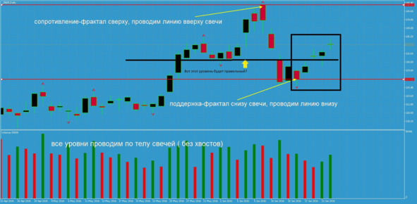 В данном случае ты правильно нарисовал черной линией уровень поддержки, мною же нарисован уровень сопротивления по свече с фракталом (уровень открытия), именно на эту свечу направлена первая снизу стрелочка. Следующая вверху красная линия показывает цель или следующий уровень. При пробое уровня цена обычна устремляется к целевому уровню и потом делает коррекцию, чтобы пойти на новый уровень.