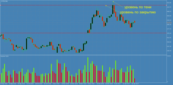На рынке быков мы смотрим верхушки свечей и проводим по ним уровни. Если мы проводим уровень по тени свечи, то пробой такого уровня всегда сильнее, чем пробой уровня просто по телу.