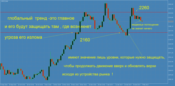 Все, что под него опускалось – скупали и рисовали ложные пробои. Пробить пробивали —но выкупили. Выкуп происходил не быстро, но никто из глобальных быков не спешил. Так, что даже и тут тренд защитили, хоть и страху натерпелись многие. Нажали вниз —все со страху все продали и выше уровня опять рынок задрали. Вот на графике все отчетливо видно. То есть главное, что тренд бычий есть, а раз он есть, то его обязательно придут защищать иначе не было смысла его начинать вообще, если не защищать!