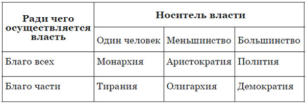 Из таблицы видно, что правильными видами государственного устройства являются царская власть (монархия), аристократия, полития. Неправильными оказываются тирания, олигархия, демократия.