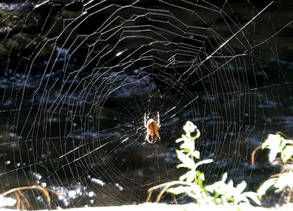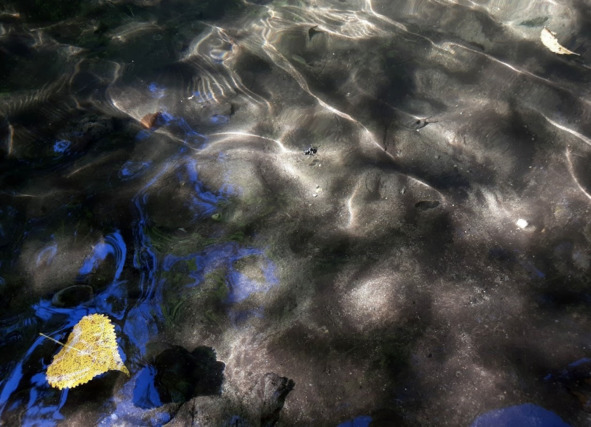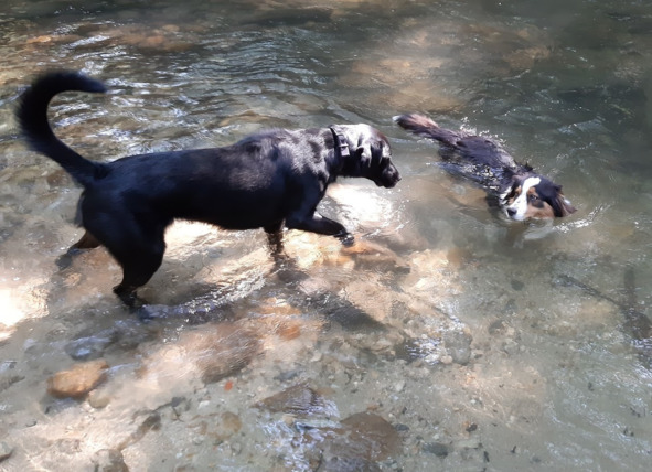Есть такая вот мелкая речушка в автомобильной близости от нас = ВерсуА, в ней даже периодически форель ловят (если всё у тебя по закону = то с лицензией, а если халявщик = то без бумажки, но с риском заполучить суровый штраф, потому что местный «рыбнадзор» беспощадно лютует и зорко следит за…), а ещё по ней иногда сплавляются на байдарках и каноэ (после многодневных проливных дождей, когда уровень воды заметно поднимается). А в летние месяцы и до практически конца сентября сОбак там с удовольствием плавает и… ныряет… И не только он один…