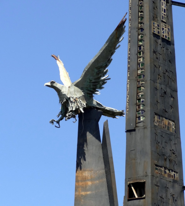 Надо помнить, что в тридцатых годах ХХ века в стране шла свирепая гражданская война. И испанский фашистский франкизм победил на оооочень долгие годы… И бои ожесточённые шли и в этих местах… И орёл этот = символ совсем не республиканцев…