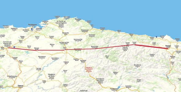 На этом месте была запланирована условная карта с маршрутом Примитивного Пути Святого Иакова, но, увы, она хоть и в открытых источниках бытует, но насколько защищена авторским правом = не смог выяснить…