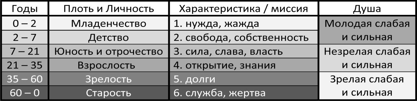 Личности с плотью чаще удается пройти за жизнь все возрастные категории. Но каждый возраст у плоти, Личности и Души имеет свою цель, потому они у каждой проявляются по-разному.