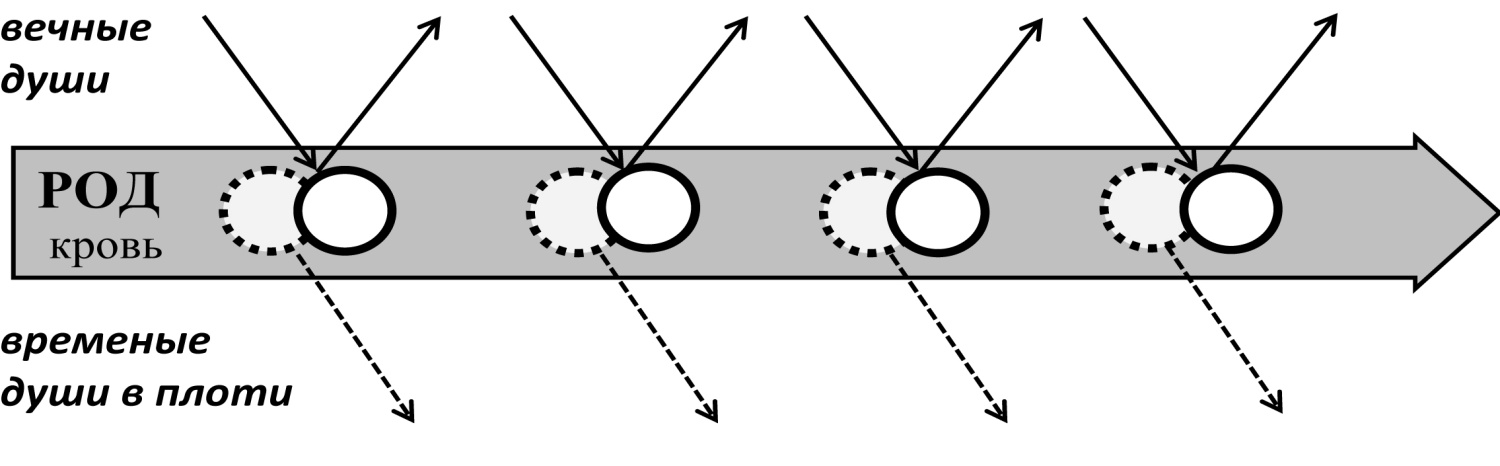 С одной стороны Личность умирает с плотью, а с другой стороны, какая-то ее часть, находящаяся животными душами в крови родителей, переходит в кровь ребенка, постепенно уменьшая свое влияние, в зависимости от силы Рода, уступая место другим родам.