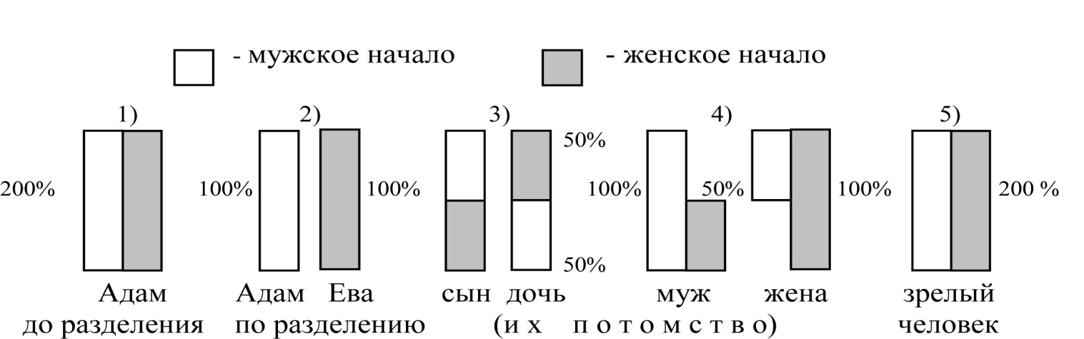 Этот процесс может выглядеть следующим образом. В одном случае при сотворении Адама Господь вложил в него по 100% мужского и женского начала, а при выделении Евы соответственно, разделил эти начала, или в другом случае при создании одновременно мужчины и женщины были им выделены по 100% начал – но это пока является предположением и загадкой. То, что в каждом из нас эти силы существуют и действуют доказывать нет необходимости. Но для более точного описания взаимоотношений этих начал, находящихся в нас и в нашем потомстве требуется небольшое объяснение.