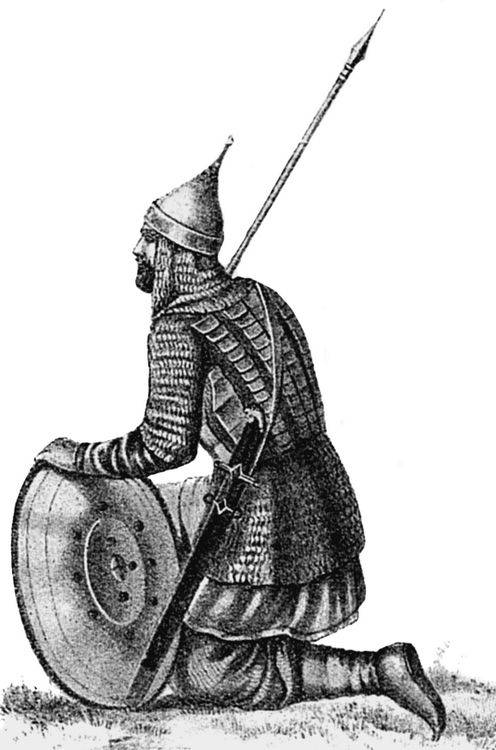 Воин времен царя Ивана III в шлеме, доспехах из железной цепи со стальными плитками, с копьем, щитом и мечом