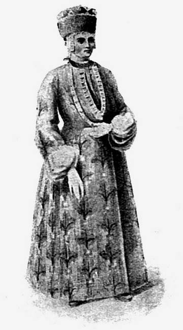 Женщины одевались по-азиатски. Обычный женский сарафан, или кубелек, был суконный и не очень длинный. Красили сукно в пестрые цвета. Шубы носили длинные, азиатского покроя. Пояса из материй, a кто побогаче, то из серебра. На руках носили браслеты, называвшиеся белезеками, или обручиками. Девушки носили на голове перевязки с медными вызолоченными гвоздиками и золотой бахромой кругом; волосы заплетали в косы, и в косы вплетали яркие ленты и мохры. Замужние женщины носили кички с высокими рогами. Против лба надевался вышитый круг и от лба до ушей были подвески. Сзади был подзатыльник, весь убранный золотом, серебром и бисерными нитками. На висках были такие же нитки, называемый чикилеками. На шее носили ожерельники из монет и монисты. На ногах были красные сапожки с железными подковками в вершок, под каблуком.