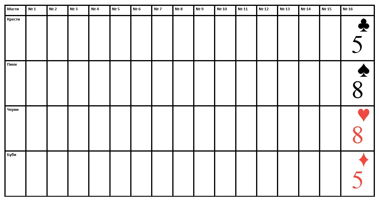 Не забывайте размещать карты по масти в нужных строках. Масть карт в строке определяется заранее, при выборе типа раскладки и указывается в левой части таблицы.