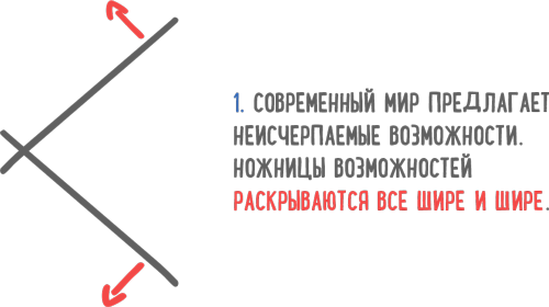 Возможности использования нашего потенциала, предлагаемые современным миром, огромны. Их можно представить себе в виде ножниц. Чем больше шансов для нас появляется в современном мире, тем шире можно раскрыть эти воображаемые ножницы возможностей. И сегодня количество этих шансов велико, как никогда.