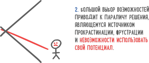 Это прежде всего проблема выбора: чем больше у нас возможностей, тем труднее на что-то решиться [114, 11, 73, 74, 71, 132, 70]. Наступает так называемый паралич решения. Обдумывание всех вариантов требует таких затрат энергии, что в итоге мы не можем выбрать ни один из них [72, 73, 132, 70]. Мы откладываем принятие решения, а вместе с тем и совершение связанных с ним действий. Прокрастинируем.