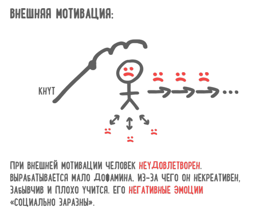 Привыкнув к внешней мотивации, люди теряют способность делать что-то по собственному желанию. Если «кнут» исчезает, они не могут сами себя мотивировать. Школьники, например, привыкают учиться ради оценок, а когда после школы это давление исчезает, они перестают получать дальнейшее образование. Внешняя мотивация подавляет в людях будущую инициативу, и без «кнута» они перестают что-либо делать.