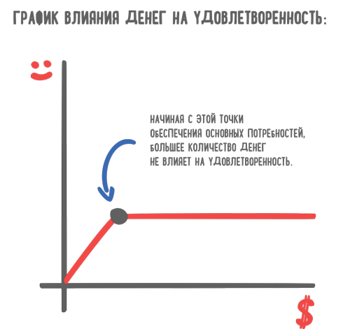 Обширное исследование о влиянии денег на счастье продемонстрировало четкую тенденцию [42, 38]: деньги оказывают влияние на состояние нашей удовлетворенности, только пока помогают обеспечить основные потребности нам и нашей семье. Выше этой границы деньги на состояние удовлетворенности почти не влияют.