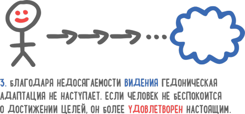 Мы чаще переживаем состояние, обозначаемое как счастье сейчас (happiness now), удовлетворенность нашим настоящим. Делая что-либо, вписывающееся в наше видение, мы чувствуем, что все идет так, как должно быть. Тем не менее мы не стоим на месте, потому что видение своим мотивационным эффектом тянет нас вперед.