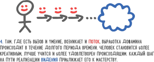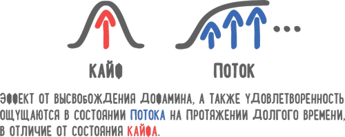 Изучение биографий самых успешных спортсменов, ученых и предпринимателей показало, что в них было нечто общее [159, 30, 36, 31, 32, 33, 35, 75]. Деятельность, которой они занимались, приводила их в состояние flow (потока)[7]. Оно возникает там, где мы встречаем вызов и вместе с тем включаем наши сильные стороны и умения [30, 31, 32, 33, 35]. Нас поглощает деятельность, которой мы занимаемся. Мы забываем о времени. В отличие от эмоции кайфа, испытываемой в течение короткого промежутка времени по достижении цели, выработка дофамина в состоянии потока возможна на протяжении долгого времени.