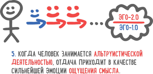 Виды деятельности, которыми мы занимаемся в нашей жизни, можно разделить на два типа. Первый – это то, что мы делаем только для себя. Сюда относятся, например, действия, позволяющие нам выжить, наше развитие или удовлетворение основных потребностей. Обозначим эти действия как деятельность эго-1.0. Второй тип – альтруистическая деятельность. То, что мы делаем не для себя, а для других. Обозначим это как деятельность эго-2.0. Именно второй тип способен породить эмоцию meaning (ощущение смысла), которое наряду с кратковременной эмоцией кайфа и состоянием потока является третьим типом нашей удовлетворенности.
