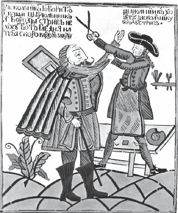 Насильственное бритьё бород. Лубок XVIII века