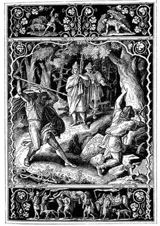 Добежав первый до ключа, Сигфрид отстегнул меч от пояса, отбросил в сторону копье и щит, и, расположившись на траве, жадно припал разгоряченными устами к струе холодной оживляющей влаги. Хаген, прибежав к ключу вслед за Сигфридом, тотчас решился воспользоваться удобной минутой для выполнения своего черного замысла… Осторожно подкравшись, он поднял страшный Сигфридов меч с травы и отнес его далеко в сторону; потом схватил его острое копье, и, высмотрев внимательно кружок нашитый шелками на его платье, вдруг изо всей силы ударил копьем в этот кружок и проколол насквозь грудь Сигфрида, так что копье проникло до самого сердца.