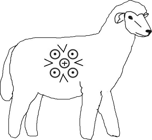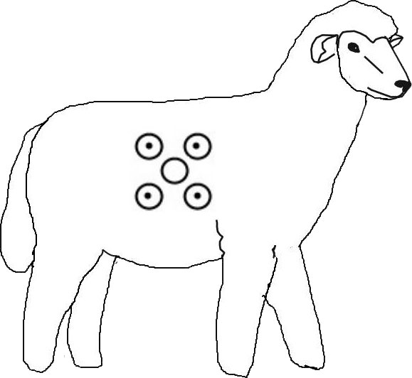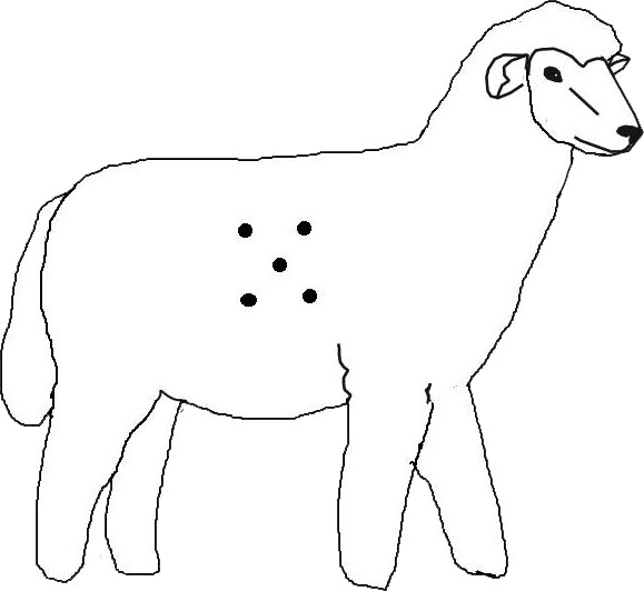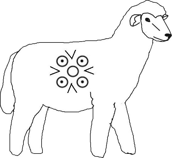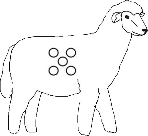 Затем усложним выдавленный рисунок другими фигурами. Поставим, например, вокруг ещё четыре таких же круга. Получилась сложная фигура составленная из пяти простых. После этого дополним некоторые круги простейшей фигурой – точкой. В данном случае, простейшая фигура (точка) на соседней овечке усложнила как простые фигуры, так и весь рисунок в целом.