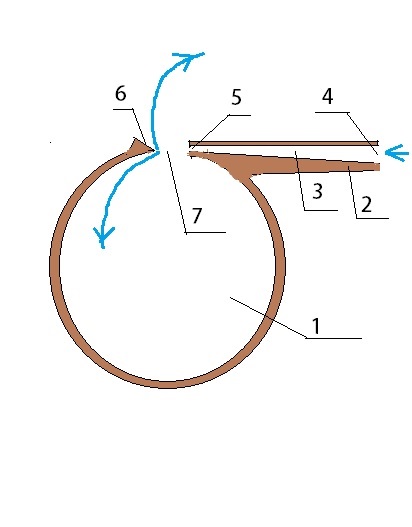 Эта воздушная струя, выйдя из дульца, пролетает вырезанное в резонаторе прямоугольное отверстие (7), устремляясь к противоположной его стороне. Противоположная сторона прямоугольного окошка имеет острую кромку со скосом (6). Жгут, налетев на острую кромку резонатора (скоса), разрезается ей на две части, на две воздушные струи (жгута). Одна струя уходит в окружающую среду, а другая входит в резонаторную камеру (обозначено голубыми стрелками). Попав в резонаторную камеру, воздушный жгут повышает в ней давление. Сдавленный воздух в резонаторе ищет слабое место, где можно вырваться из камеры и находит его – это прямоугольное отверстие в резонаторной камере в которое он и влетел.