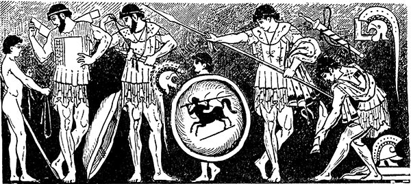 Афинские гоплиты, снаряжающиеся в поход. Изображение на аттической вазе. V в. до н. э.