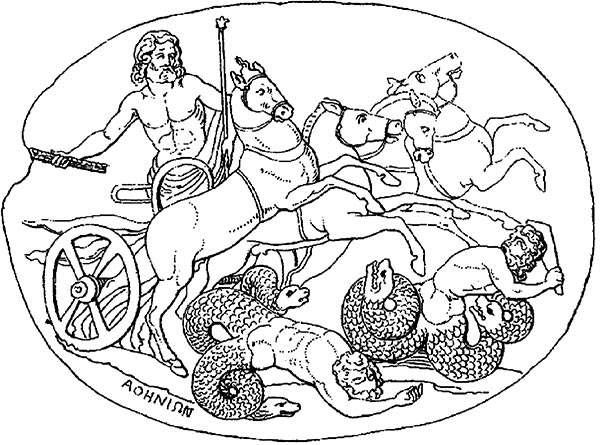 Далее следует Посейдон, владыка морей, который может своим трезубцем возмущать и укрощать волны. Он ездил на колеснице в виде раковины, влекомой морскими чудовищами. Его звали Зевс морей.