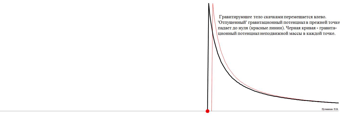 На рисунке Солнце изображено в виде маленькой красной точки, в которой сосредоточена вся его масса. С каждым новым «скачком» Солнца влево, «оставленный» им гравитационный потенциал сразу же начинает спадать до нуля, и фронт этого падения движется вправо со скоростью света. Каждый новый «график» гравитационного потенциала будет подменять собой предыдущий, сформированный предыдущим положением Солнца.