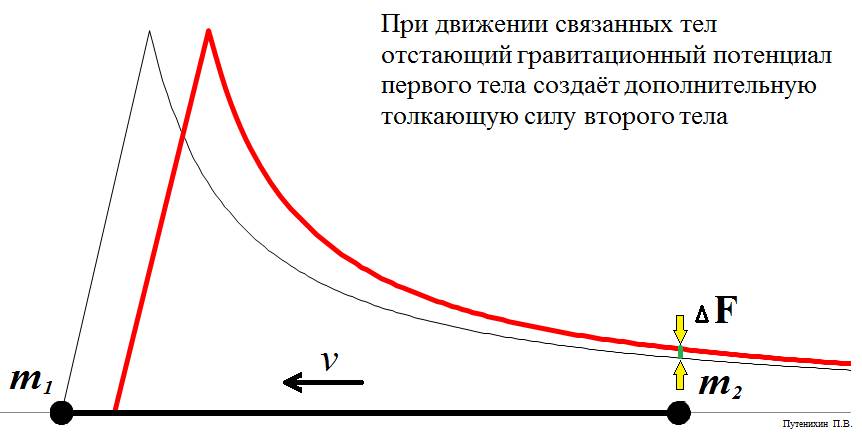 Но, можно возразить, такая же сила, вероятно, действует и на головную массу, тормозя систему? Нет! Для головной массы действует эффект в точности противоположный. Гравитационный потенциал ведомой массы отстаёт от ведущей, поэтому ведущая масса оказывается под воздействием уменьшенной силы от притяжения ведомой. Поэтому она так же не будет уравновешена силой сжатия стержня, и стержень будет толкать эту массу вперёд.