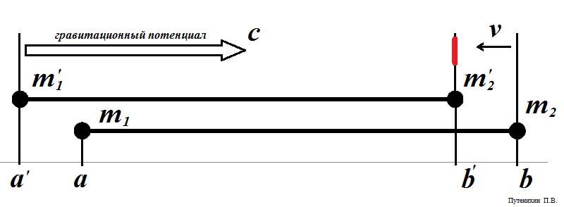 Путь стержень движется со скоростью v вдоль своей оси. За некоторый момент времени ведущая масса переместится из точки a в точку a', а ведомая – из точки b в точку b'. Из точки a' гравитационный потенциал ведущей массы начал создавать обновленные значения поля в направлении ведомой массы со скоростью света – с. До того момента, когда фронт прибудет в точку b', там «действует» прежнее, большее значение потенциала.