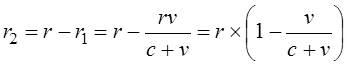 Ведомая масса движется навстречу этому фронту со скоростью v, находясь в поле с последним значением потенциала. Поскольку на начало движения расстояние между массами было равно r, фронт от ведущей массы встретится с ведомой массой в точке, отмеченной красной чертой, через время t = r / (c + v). За это время ведомая масса приблизится к точке, из которой началось движение фронта нового значения потенциала, на расстояние b – b' = r1 = vt = rv / (c + v). Следовательно, ведомая масса окажется в точке с потенциалом, соответствующим этому изменённому расстоянию