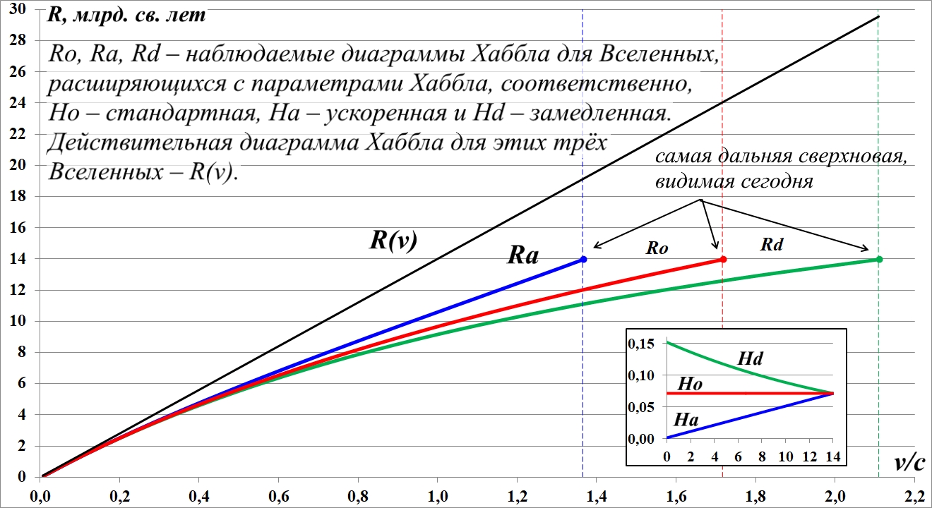 На рисунке чёрный график R(v) – это слившиеся в один графики теоретического закона Хаббла для Вселенной с H0 и теоретических графиков законов Хаббла для Вселенной с убывающим, Hd и с возрастающим, Ha параметрами Хаббла. Это слияние индивидуальных теоретических графиков Хаббла, собственно говоря, достаточно очевидно, поскольку является следствием того, что в конечной точке, в наши дни все параметры равны H0, и диаграммы соответствуют именно этому моменту времени, когда во всей Вселенной объекты удаляются друг от друга именно с этим параметром Хаббла. При этом отметим некоторую условность: мы принимаем, что скорость источника фотонов равна скорости удаления сверхновой на момент наблюдения фотонов.