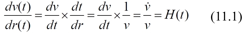 Наблюдаемыми диаграммами мы называем диаграммы, построенные на основе наблюдаемых яркостей и скоростей сверхновых, которые явно зависят от времени в пути света от них. Отметим, что наблюдаемые параметры Хаббла, согласно этим диаграммам, будут отличаться от исходных, действительных параметров, изображённых на рис.11.1. На рис.11.3 каждой точке диаграмм R соответствуют значения скорости и времени, следовательно, мы можем по точкам этих графиков построить и графики H(t)=v(t)/R(t). Но можно использовать и те же таблицы данных, по которым построены эти диаграммы R(v). Правильным способом построения параметров Хаббла в этом случае является дифференциальный, согласно уравнениям: