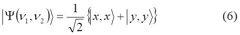 Это оптический вариант мысленного эксперимента ЭПР в версии Бома [5]. Источник S испускает пару фотонов с различными частотами v1 и v2, разлетающихся противоположно. Предположим, что вектор состояния поляризации, описывающий пару:
