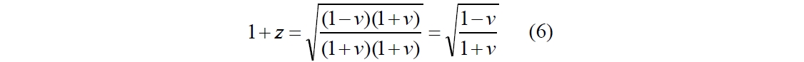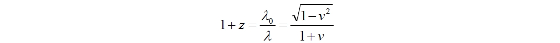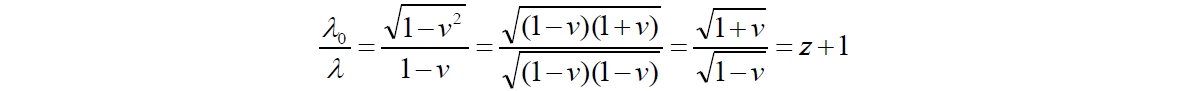 Это, очевидно, верное соотношение. Действительно, если v = 0, то длина наблюдаемой волны равна длине излучаемой. Иначе, при удалении наблюдателя от источника, длина наблюдаемой волны всегда больше длины излучаемой. Напротив, при сближении, отрицательном значении скорости, длина волны оказывается меньше излученной. Если подставить эти значения длин волн в уравнение для красного смещения, то получим: