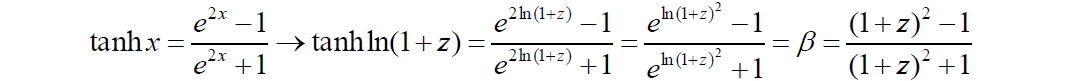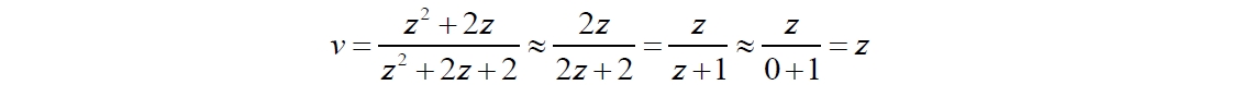 Странный знак минус с неясными обоснованиями следует отбросить. Из исправленного уравнения, отбрасывая величины высших порядков малости, можно получить традиционное уравнение приближенных значений скорости для z << 1