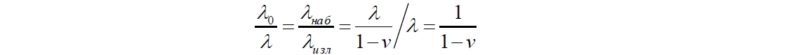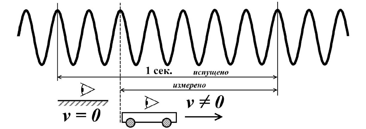 Очевидно, и не требует отдельных доказательств, что измеренная длина волны для неподвижного наблюдателя равна излученной длине волны λизл. В этом случае приёмник, наблюдатель зафиксирует количество колебаний, равное: