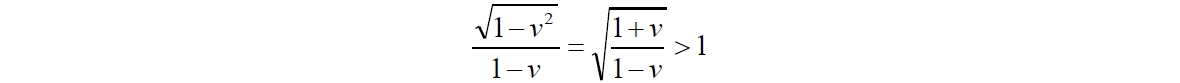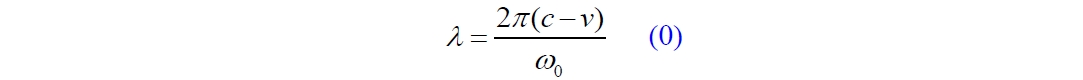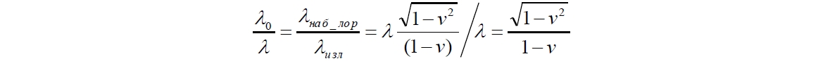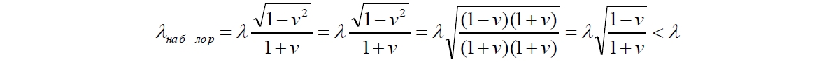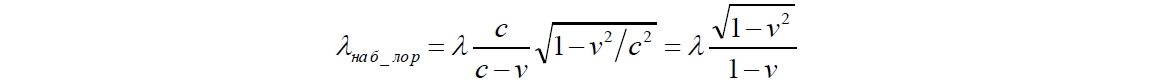 Соотношение выглядит корректным, поскольку, действительно, при удалении приёмника вычисленная по нему длина волны λнаб всегда больше излученной. Иначе, при нулевой скорости они равны, а при сближении (скорость отрицательна) вычисленная длина волны λнаб всегда оказывается меньше излученной. Однако здесь мы обязаны учесть ещё один эффект – лоренцево сокращение длины. Поскольку измеряемый участок волны как физический объект движется относительно неподвижного наблюдателя, его внутренняя линейка сокращается относительно неподвижной линейки наблюдателя. Это прямо следует из принципа относительности: если приемник движется относительно источника с некоторой скоростью, то это тождественно тому, что и источник движется с той же скоростью относительно приёмника. Поскольку нас интересует картина с точки зрения приёмника, то мы и принимаем, что именно источник движется относительно него. Из этого следует, что движущемуся наблюдателю длина волны и связанная с источником и движущаяся вместе с ним линейка видятся более короткими: