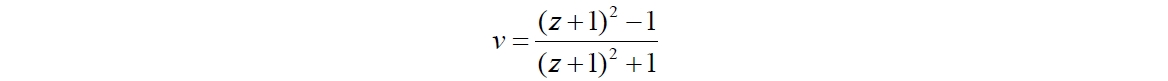 Нередко в литературе указывается, что такое приближение допустимо при красных смещениях до величины порядка z ~ 0,1 [7]. Однако такое приближение сделано "на глазок". Разумнее выяснить, как зависит погрешность вычисления скорости от красных смещений. Точное значение скорости определяется уравнением (7). Переход к приближённому уравнению связи красного смещения и скорости v = cz может быть произведён также отбрасыванием членов высшего порядка через разложение Тейлора, как это описано в [1, с.406]: