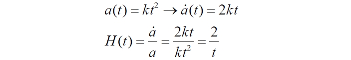Утверждается, что вид этой формулы лишает всякой возможности придумать убывающую функцию масштабного фактора a(t), при которой убывал бы и параметр Хаббла. Действительно, из этого уравнения, на первый взгляд, явно следует, что росту масштабного фактора соответствует убывание параметра Хаббла. Однако перепишем уравнение условно и кратко: