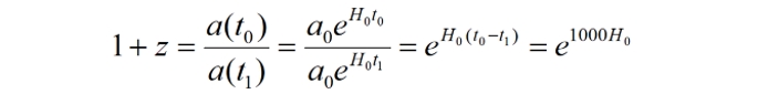 Теперь произведёт такие же измерения, спустя 109 лет. В этом случае, с учётом моменты наблюдений возрастут до: t0' = t0+109 и t0' = t1+109. Соответственно, за такой же интервал наблюдений – 1000 лет, то есть мы получим значение красного смещения: