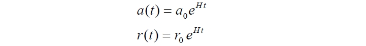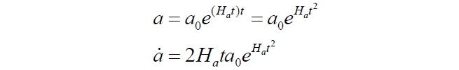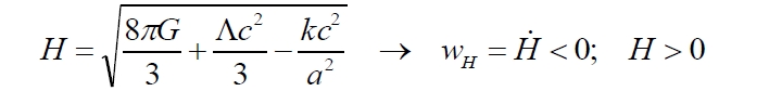 И, действительно, мы получили параметр Хаббла, явно убывающий во времени. При этом произведший его масштабный фактор растёт. Что же получилось? Масштабный фактор растёт, а параметр Хаббла убывает, то есть, ускоренно расширяющейся Вселенной соответствует убывающий масштабный фактор. Но здесь мы вновь укажем на неправомерное отождествление "расширяющаяся" Вселенная и "ускоренно расширяющаяся" Вселенная.