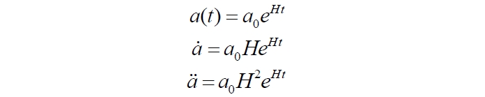 Как видим, значение ускорения равно нулю, что и означает равномерное расширение Вселенной, без ускорения. Теперь приведём пример масштабного фактора с некоторым условным параметром Хаббла, соответствующим ускоренно расширяющейся Вселенной: