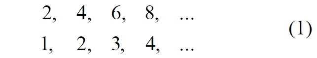 Нумерация четных чисел. Например, в одном из вариантов для доказательства равномощности предлагается записать четные числа в виде бесконечного ряда, а под этим рядом написать их порядковые номера из натурального ряда чисел [7, с.78]: