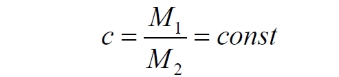 Рассмотрим приведённый выше пример в терминах мощностей. Примем без доказательства, что количество членов множества и его мощность – это разные, но схожие по смыслу понятия. Мы не можем сравнивать число членов множеств, по определению равных бесконечности, но мы можем сравнивать их мощности. Отношение мощностей М1 и М2 равномощных множеств всегда равно конечному числу: