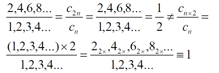 Это определённо означает, что мощности множеств всех натуральных чисел и суммы множеств всех четных и нечетных чисел равны. Но это также означает и тождественное равенство их бесконечного количества членов. Очевидно, что множества четных и нечетных чисел равномощны, поэтому, разделив полученное равенство на cn, получим: