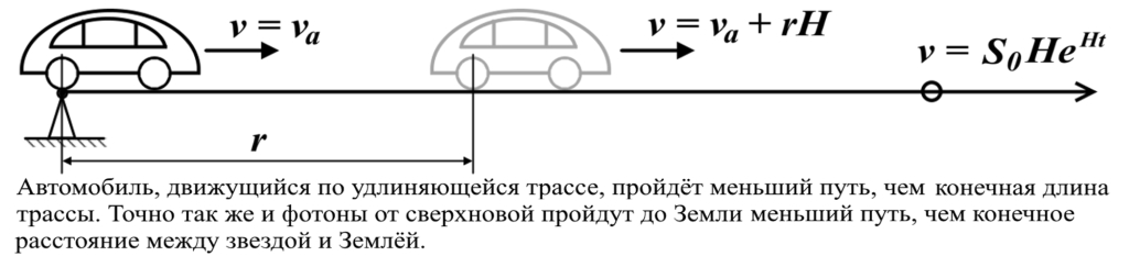 Мы рассматривали движение авто на вытягивающейся дорожке. Однако все приведённые рассуждения полностью соответствуют и движению фотона от некоторой сверхновой к Земле в расширяющемся пространстве Вселенной. Поэтому в итоговых уравнениях мы можем просто заменить скорость авто скоростью света: